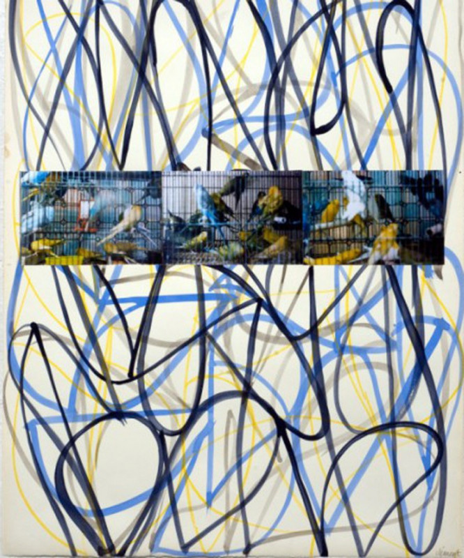 Composition : la surface est mise au carreau. Chaque surface carrée comporte une information visuelle particulière n’ayant, seule, pas assez de caractéristiques pour permettre son identification avec une réalité extérieure (c’est une photo, une couleur, un trait, une lettre). L’ensemble forme les maillons d’une chaîne d’inscriptions à lire en interactions cumulatives et qui constituent les conditions nécessaires et juste suffisantes pour y reconnaître l’image déconstruite d’un paysage de mer. C’est à la fois l’image de la façon dont est fait ce tableau (formalisme) et ce à quoi il renvoie (naturalisme)[i]. »