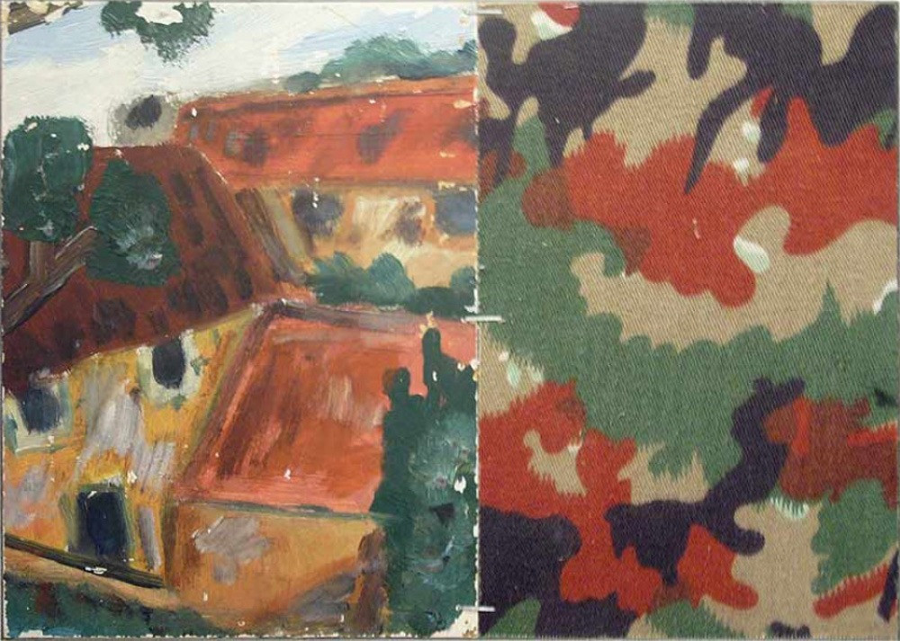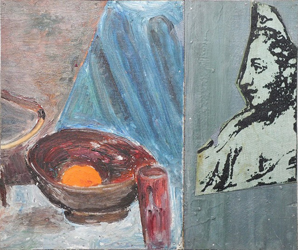 Nature morte avec allégorie. Huile sur bois et collage. 32,5 x 39 cm. 2005