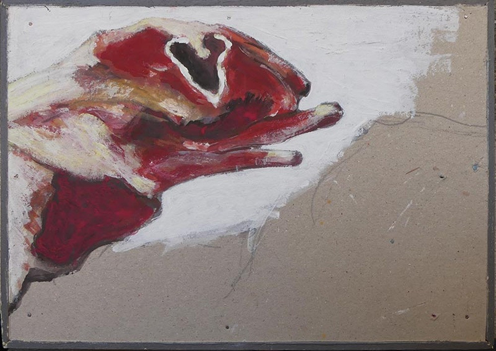 Tête de lapin écorché. Peinture sur bois. 19,5x27,5cm. 2017