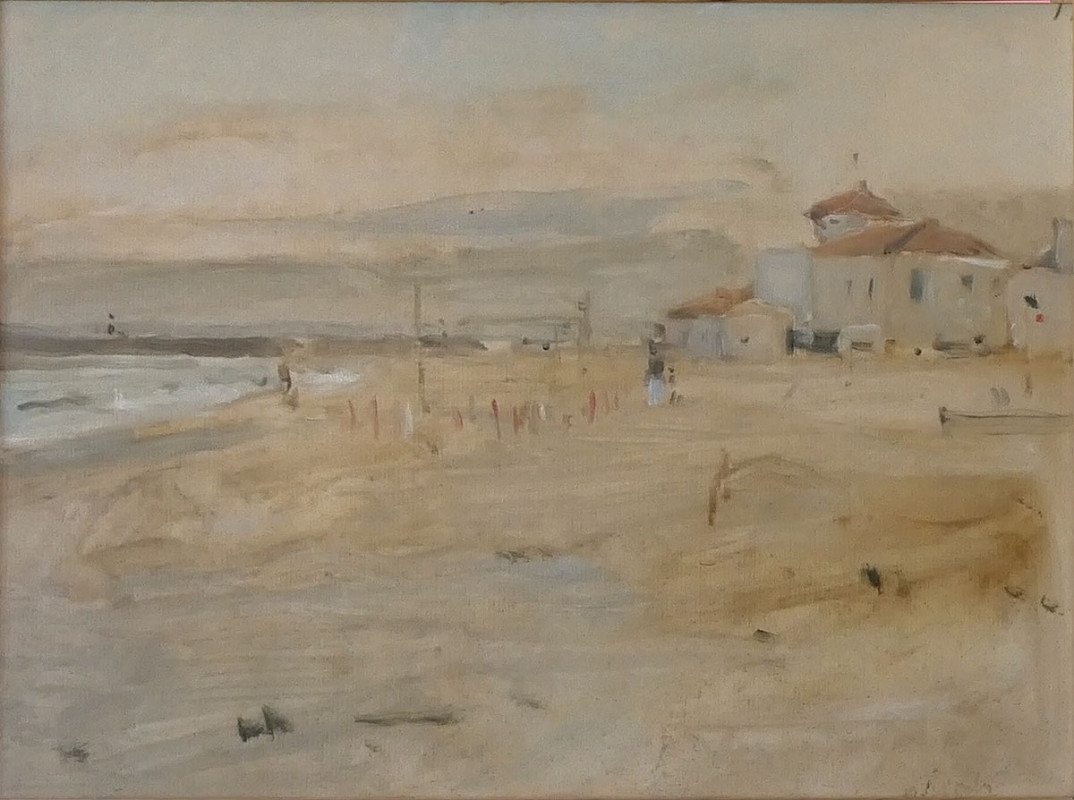 La plage de Palavas. Huile sur bois. 27 x 35 cm.1960. Signée, titrée et datée au dos.